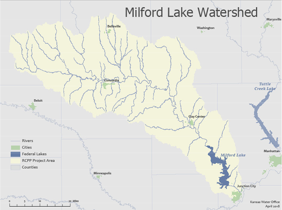 The Milford Watershed RCPP focuses on the Kansas portion of the watershed within the Lower Republican Basin in Clay, Cloud, Dickinson, Geary, Jewell, Mitchell, Republic, Riley, and Washington Counties.